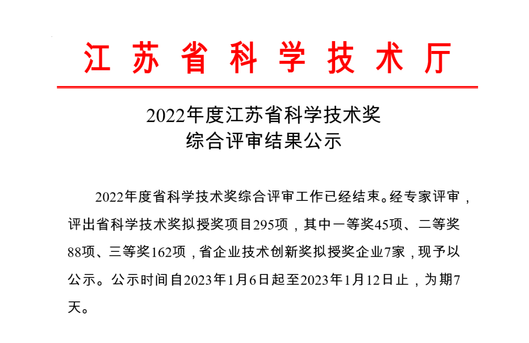 江苏省科学技术奖是江苏省科技领域的最高奖项,主要奖励在技术发明、技术开发、重大工程建设、科学技术成果推广转化、高新技术产业化、社会公益等方面取得显著经济效益或社会效益的科技项目。